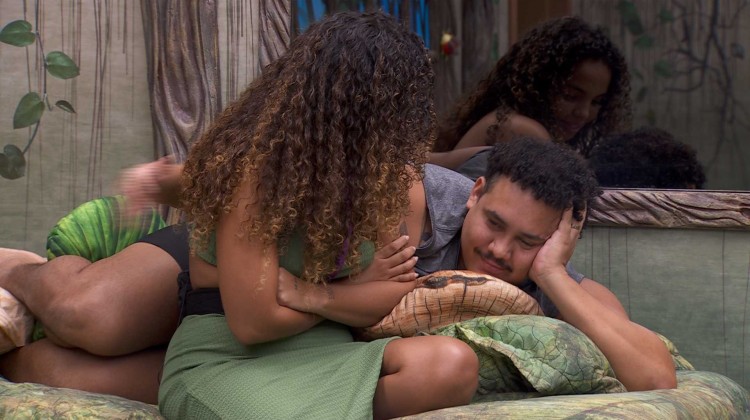 Lucas Henrique, que também está no local, chama Pitel para sua cama. O brother pede para que a sister se aproxime e sente no local.