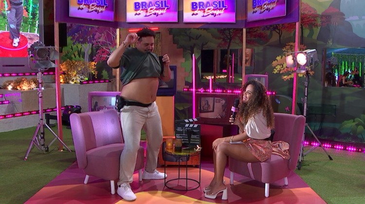 Na Festa da Líder, Pitel brinca de entrevistar os brothers da casa mais vigiada do Brasil como se eles já tivessem sido ganhadores do BBB 24. Na vez de Lucas Henrique, a sister pergunta sobre o diferencial dele. O brother puxa a camisa até a boca e rebola na frente da assistente social.